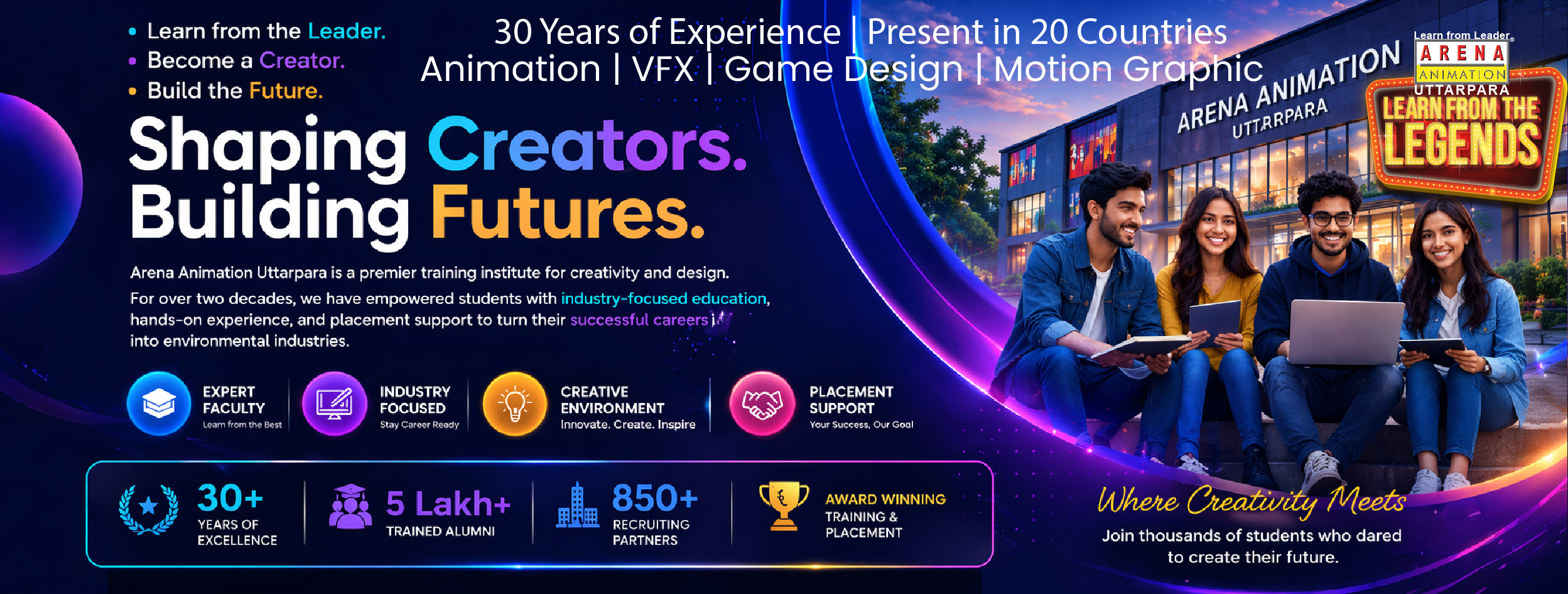Arena Animation Uttarpara is a premier institute offering industry-focused training in Animation, VFX, Gaming, Graphic Design and Digital Media. As part of the globally recognized Arena Animation network, we are committed to delivering high-quality education that meets current industry standards. We take pride in being among the few centres with Head Office (HO) Certified Faculty, ensuring expert guidance and professional mentorship for every student. Our hands-on learning approach allows students to work on real-world projects and build strong portfolios. With modern infrastructure, the latest tools and dedicated placement support, we prepare students for successful careers in the Media & Entertainment industry. Our strong placement assistance connects students with leading studios and companies, helping them launch their careers with confidence. At Arena Animation Uttarpara, we don’t just teach software—we build creative professionals and future industry leaders.